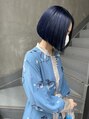 襟足ぎりぎりに切ったバックシルエットから、前下がりに落ちたシャープな前下がりボブ。クールなヘアスタイルには相性の良いブルーカラーをチョイス。ワンブリーチでしっかりベースを作って深めのネイビーブルーでモードな印象に。