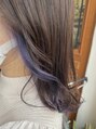 元々の超ロングだったスタイルを、バッサリカットしてイメチェン☆レングスは肩甲骨の辺り、顔周りにかけて、ほんのりレイヤーを入れて可愛く♪顔まわりに入れた【シアー・ネイビー】のイヤリングカラーが、アクセントになってて甘すぎないスタイルの完成☆