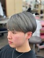 カットはツーブロック・マッシュ。刈上げ部分は残して残りをブリーチ。ペールイエローまでブリーチで抜きます。その上からマット系のシルバーを塗布。仕上げはストレートアイロンで艶と丸みを作ります。くせ毛のお客様は髪質改善ストレートがお薦めです