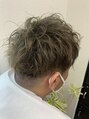 黒髪からツーブロ以外の部分をブリーチ剤で明るくベースを作った後、脱色で残る赤味やオレンジ味を かき消す調合のカラー剤を重ねて くすみ感のあるハイトーンベージュに仕上げたカラースタイルです。頭皮が敏感でカラー剤が染みやすい方は事前にご相談下さい