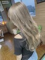 グレージュ系ベージュ。照明、毛先のぬけ具合でシルバーよりになるくらいのハイトーンカラーです。