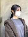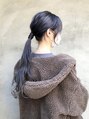 深いブルーにハイライトでニュアンスを。ラフなポニーテールアレンジもおしゃれに◎顔まわりはおくれ毛用に少し短くカットしています。