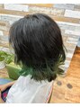 カット、ポイントブリーチ、ポイントカラー。外はねレイヤーボブ。毛先のみブリーチして、塩基性カラーのターコイズをオン。黒髪×グラデーション。裾カラー。
