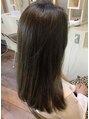 赤みを抑えた少し暗めの緑系ブラウン。光に当たると分かるくらいにしています。(N.リーフレット)