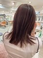 大人ハイライトを入れて、8レベルのグレージュカラーで全体にオンカラー。細いチップで上品な印象に仕上げています。ミディアムレングスにワンレングスでカット。