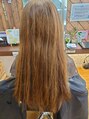 7トーンのブラウンのハーブカラーにフローディアトリートメントのボンデイド(髪質改善トリートメント)ドライしただけで真っ直ぐまとまる髪質に!肩下は矯正毛 根元から肩位は未矯正なのに癖が伸びました。写真は ドライ後、アイロン後、施術前になります