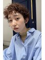 マッシュショートに強めのカール、ブリーチ無しの明るめのオリーブカラー。ファッジな雰囲気がオシャレなスタイル。