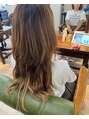 ロングヘアのハイレイヤー、ウルフヘアです。積み重ねでハイライトを何度も入れていますケアブリーチを使用してダメージレスにアルティストカラーでキレイな色味をのせています。お客様のbeforeの状態によってはカラーは1回で完成しない事もあります