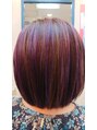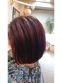 縮毛矯正を定期的にしています。今回はグレイカラーリタッチをし 前回 メッシュを入れた部分に ヘアマニュキュアのバイオレットで色をプラスし 派手になりすぎない様に仕上げました。