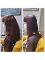 最高難易度ダメージ毛の新規お客様です。ブリーチこそしていないものの、月一カラーと酸熱トリートメントで髪がバサバサチリチリザラザラになってしまい普通なら施術不可能と言われる状態で当店の髪質改善酸性ストレートにてまるで絹の様な髪質になりました。