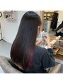 【気に入って頂いたスタイルは、ブックマークをしてご提示ください】イヤリングカラーの赤が映える髪質改善カラーです。以前のブリーチをそのまま活かしたので今回はブリーチはしていません。デザインカラーにも髪質改善カラーはオススメです。【広島】