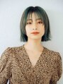 ブームとも言える切りっぱなしボブのスタイル。ぱつっときり、ぽてっとした重たさを残しながら、顔まわりにレイヤーを入れ込むことによって、顔まわりに明るい印象を与えている。前髪付近は、少し短く作っているのでさらに若々しさがある。