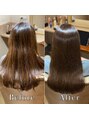 髪が細めのロングで引っかかりやすい髪が、毛先までスルンとくし通りのよい艶髪になりました。実際に触って頂いたお客様からは、「ツヤツヤサラサラで本当に自分の髪なんですか!?とても嬉しいです」と、とても喜んで頂きました。髪質改善カラーコース