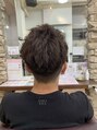 カットはバック、サイドをツーブロックにしトップは根元から立ち上がりやすいよう量感調整もしっかりしています。カラーはブラウン系の色で毛の硬さを和らげるようにしました。