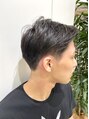 頭の形をどの角度から見ても、立体的にみせるオリジナルのカット技法を使っています。サイドのツーブロック部分とバックとの繋がりの良さもこだわっているポイントです。