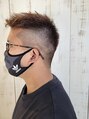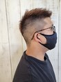 周りを2mmで刈り上げ。ソフトモヒカンベース。前髪は左にかけてやや長くなるようにアシメに。