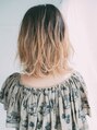 鎖骨あたりで切りそろえたやや前上りワンレングスのミディアムボブ。スタイリングは太めのコテで巻いてクールな雰囲気に。重ためのバングも大きくカールさせ隙間を作りました。グラデーションカラーで根本はあえて地毛の黒にしてコントラストを強調しました。