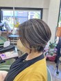 白髪ぼかしハイライトのショートボブスタイル♪カットは後頭部に丸みが付く様グラデーションをしっかり入れてあげて、全体に間引く様に質感カットを入れて軽さと束感が出る様に♪ハイライトは白髪がぼかせる様にしっかりコントラストをつけてあげて♪