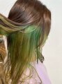 ケアブリーチの後に発色の良いカラーを使いグリーンにベースは暗くなりすぎない程度のカラーで