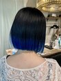 前下がりボブをケアブリーチを使い1ブリーチして根本にブルーブラック、毛先には鮮やかなブルーをオン。色落ちも綺麗です。2ブリーチ必要な場合もあります。