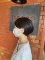 カットは襟足短めのショートですが、レイヤーは入れすぎず丸みをつけて毛量調整しました。サイドは耳にかけられるように、耳下の長さに合わせました。カラーは、アッシュブラックで赤みが出ないようにトーンダウンしました。