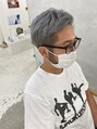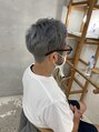 メンズさんのショートヘアでのダブルカラー。計2回のブリーチでキレイに脱色して、グレーカラーをオンしてます。横と後ろは刈り上げですっきり、前髪上げるスタイルです。
