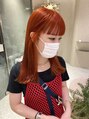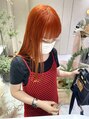 カットラインを出したミディアムヘア。前髪は眉毛ギリギリでカット。カラーはブリーチ1回でパキッとオレンジ。赤味も入れてお肌のトーンもさらに明るく!