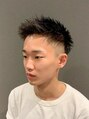 直毛でサイドが広がる髪質、刈り上げの位置を調整しハチ張りもカバー。前髪を立ち上げ頭の形がキレイに見えるスタイル。爽やかな清潔感の好印象スタイル。黒髪ならジャケパンやスーツにも相性が良く、ビジネスにも対応できる。10代20代に大人気のヘアスタイル