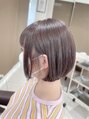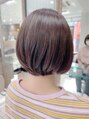 トーンダウンで色味をプラスしたモーブバイオレット。ベージュをmixして主張しすぎない色味に♪シンプルなショートボブにはツヤツヤのカラーが◎透明感ある仕上がりで軽やかに!えりあしも短くして首もとを細くよりキレイに魅せるスタイルです。