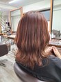オレンジベージュカラー。退色して10レベルくらいになったベースにワンカラーでカラーリング。暖色系の艶感が巻き髪と相性抜群◎☆