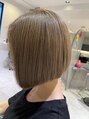 前下がりのワンレンでカット。色は、ブリーチ後、ミルクティベージュでカラー。