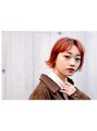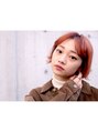 襟足ギリギリまで切り込んだボブスタイル。明るめのベースに更にハイライトを入れても全体をオレンジ系の暖色でカラーリング。