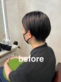 サイドをツーブロックにカットして襟足はつなげるように刈上げます。カットラインは重めのマッシュルームにカット。丸みのあるスタイルなので落ち着いた印象になります。クセのある方はストレートアイロンでストレートにするといいと思います。