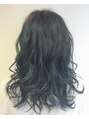 セミロングヘアに少ししっかりめのスパイラルをかけてサファイヤカラーでブルーブラック系にしっかりとトーンダウン。