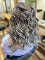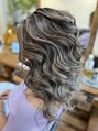 ハイライトとバレイヤージュをデザインしてベースを作り、その後、根元にシャドールーツとホワイトグレー系でmixしたカラーを乗せて完成です。ブリーチは2回、全てケアブリーチ使用。カラー剤はイルミナ、アディクシー、コレストン、キャラデコ使用。