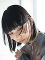 耳まで大胆に切り込んだワイドバングに表面の毛束を姫カットにしてかぶせてバックのボブラインとの調和を取りつつアクセントにしたアンニュイモードなデザインカットボブ。黒髪ベースのカラーの毛先にはフォレストグリーンの裾カラーで抜け感を。