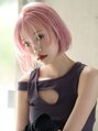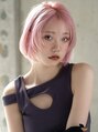 16トーンのハイブリーチ後に入れるクリアなペールピンクカラーが印象的なぱつっとラインの無造作ミニボブ。ややワイドにとってマッシュっぽく丸くカットした長めのシースルーバングでアンニュイな抜け感を。前髪は薄く垂らしても分けてもOKな2way仕様です。