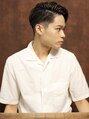 トップを長めにしてアウトラインをすっきりとさせたツーブロックショート。サイドパートで上げれる様にサイドとツーブロックラインのつながりをよくさせています。カラーは根元の黒い部分を残してブリーチし、グレージュの色味をかぶせます。