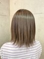 少し線がでるくらいの太さでハイライトをいれました。赤みのないグレージュ系をのせ、くすみすぎないカラーで今っぽさを出しました。段なしのボブなので傷みも考慮して表面の見える部分メインにハイライトを入れてます。
