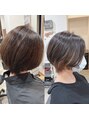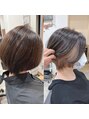topの毛を残し、インナーをすべてブリーチ。一回でできるだけ抜き、明るめのベージュにしました。上のセクションはグレー系で暗いけど透明感があります。ショートにスパイスを足して楽しみましょう。張 明星