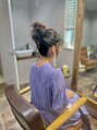 ボリュームある崩した高めのお団子スタイル。二つに分けて結んでいます。