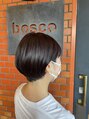 サイドは耳にかけられる長さを残して軽くしました。バックは丸みがつくようにレイヤーを低めにいれ、襟足は短くスッキリショートです。カラーは7トーンのピンクブラウンです。