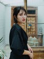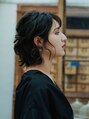 切りっぱなしのボブ スタイルになります。カラーはブルーブラックで透明感があるカラーなので重たい印象にならずオススメです。26mmのコテで前髪までミックス巻きします。ハーフアップしてランダムに引き出して立体感のあるアレンジになります。