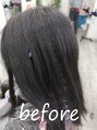 髪の毛が固く、広がりやすいロングのお客様。写真では見づらいですが、頭半分より下はブリーチ毛でのご来店でした。黒髪部分は弱酸性、ブリーチ部分は酸性域でナチュラルストレートに。イヤリングカラーの金髪部分はバイオレットブルーをチョイスしました。