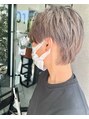 全体ブリーチ後にほんのりラベンダーを加えたグレージュをオンカラー。黄色味を抑えたクールでカッコいいベージュカラーに仕上げています◎カットはもみあげだけ2ブロックに切って、残したえりあしとバランス良く軽くしています*
