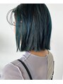 肩上にラインを合わせた切りっぱなしボブ◎朝のスタイリングも乾かしてオイルをオンするだけで簡単に決まります!カラーは、少しアクセントの効いた太めハイライトにターコイズブルーを◎他と差をつけたい方におすすめカラーです◎