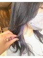 もともとブリーチしてある状態にブルーブラックで深く色を入れました。インナーはパープルを入れました。耳にかけたり巻いたりすると印象が変わって見えてオススメです!