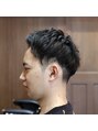 <理容室><バーバー>サイドのみツーブロックにし、6mmのバリカンで刈り上げてアップバングで爽やかを演出!!トップは左~右に向かって流します。