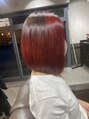 他店履歴のデザインブリーチ履歴に目の覚めるようなRedを入れさせていただきました。綺麗に内に入るような前下がりボブでモードな印象に!