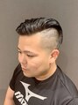サイドは大胆なハイフェード、バックはローフェードに刈り上げ、トップの長い髪を片側に流した震災刈りスタイル。ハードな印象ですが、頭の形、髪質、M字などの悩みをカバーしやすいスタイルなので、30代、40代のおしゃれビジネスマンにも人気の髪型です。